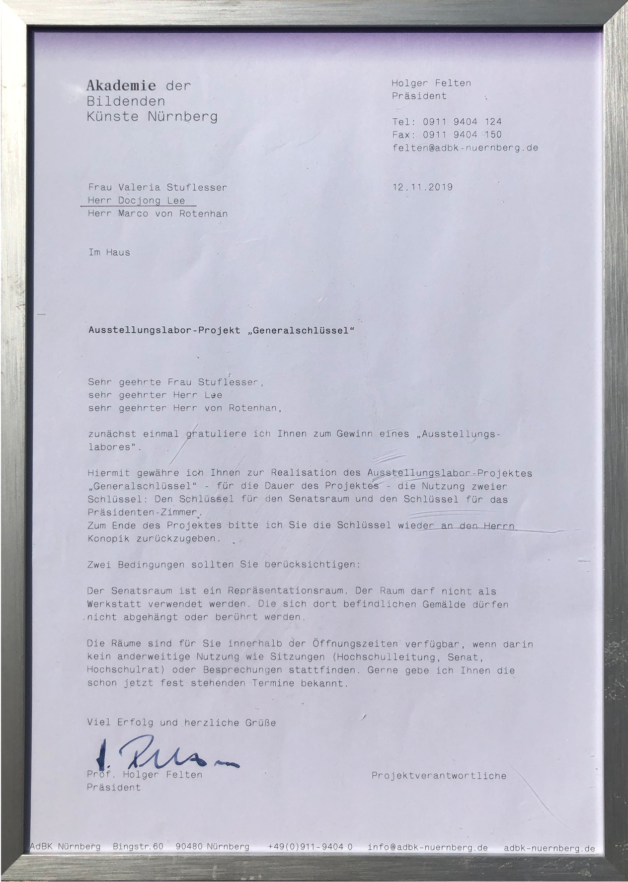 Generalschlüssel(The Master Key)프로젝트는 대학교의 마스터키를 학교로부터 빌려 미술적인 방법안에서 복제를 하여 실제 복제한 열쇠로 학교의 문을 열려고 시도하는 프로젝트입니다.