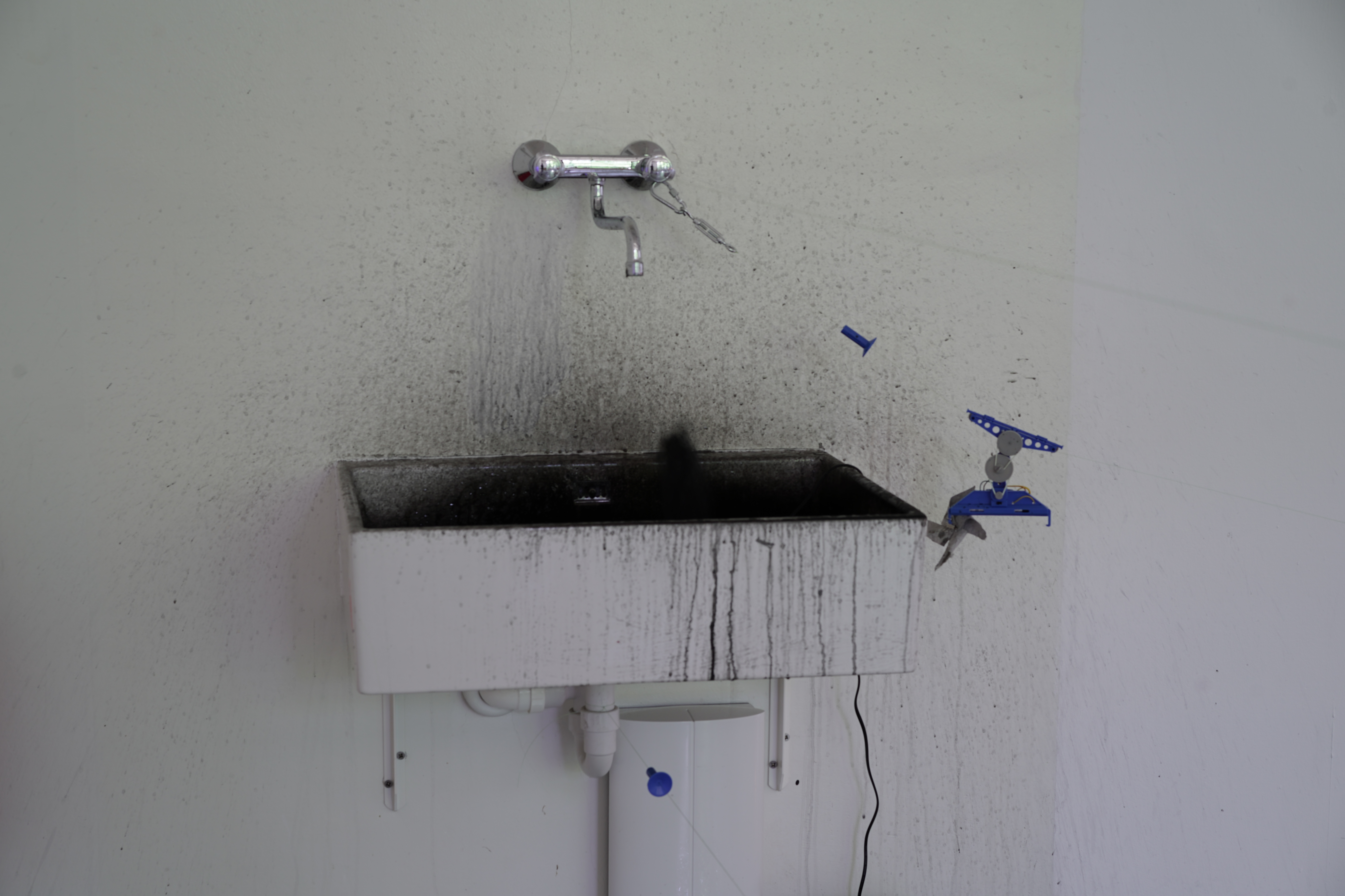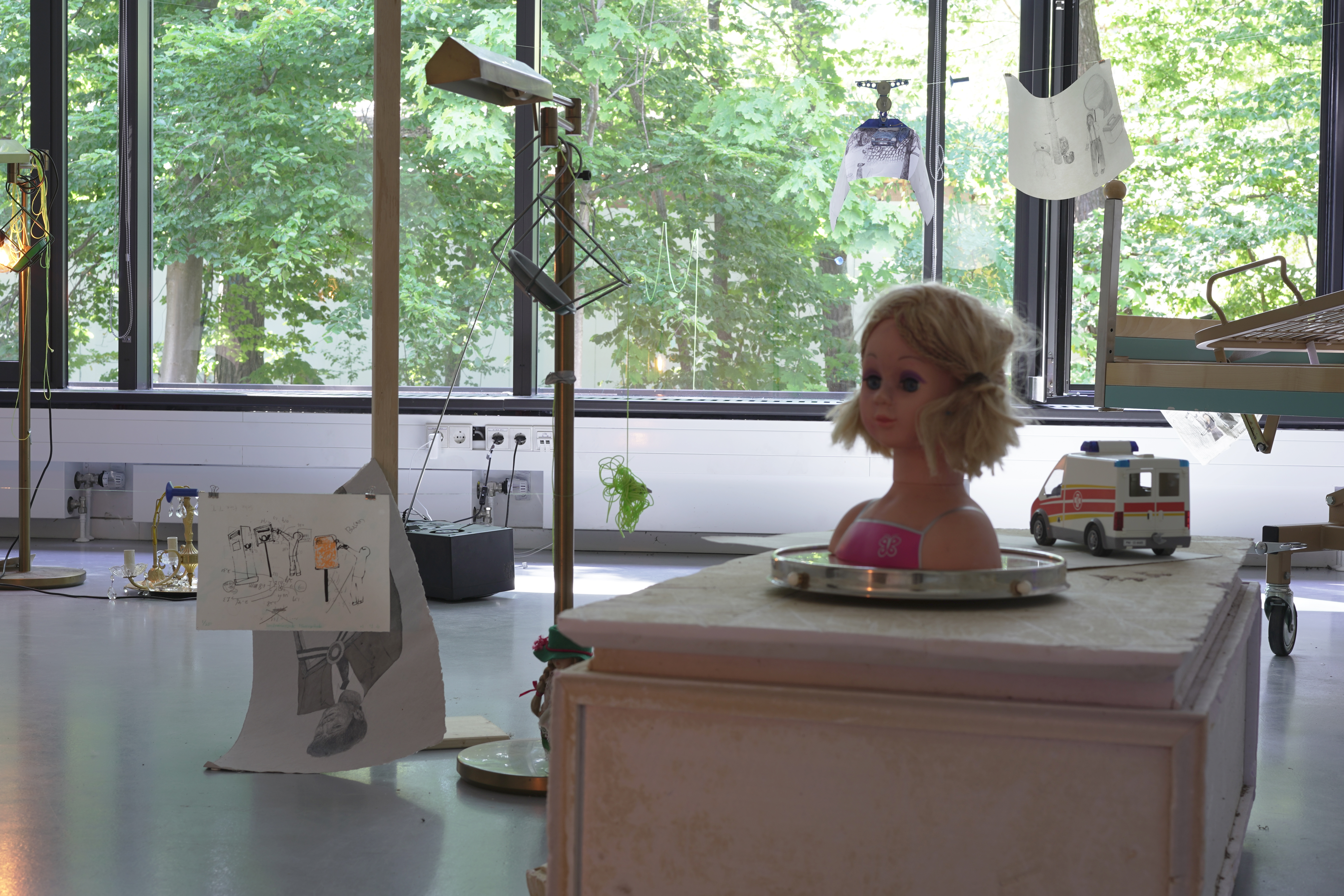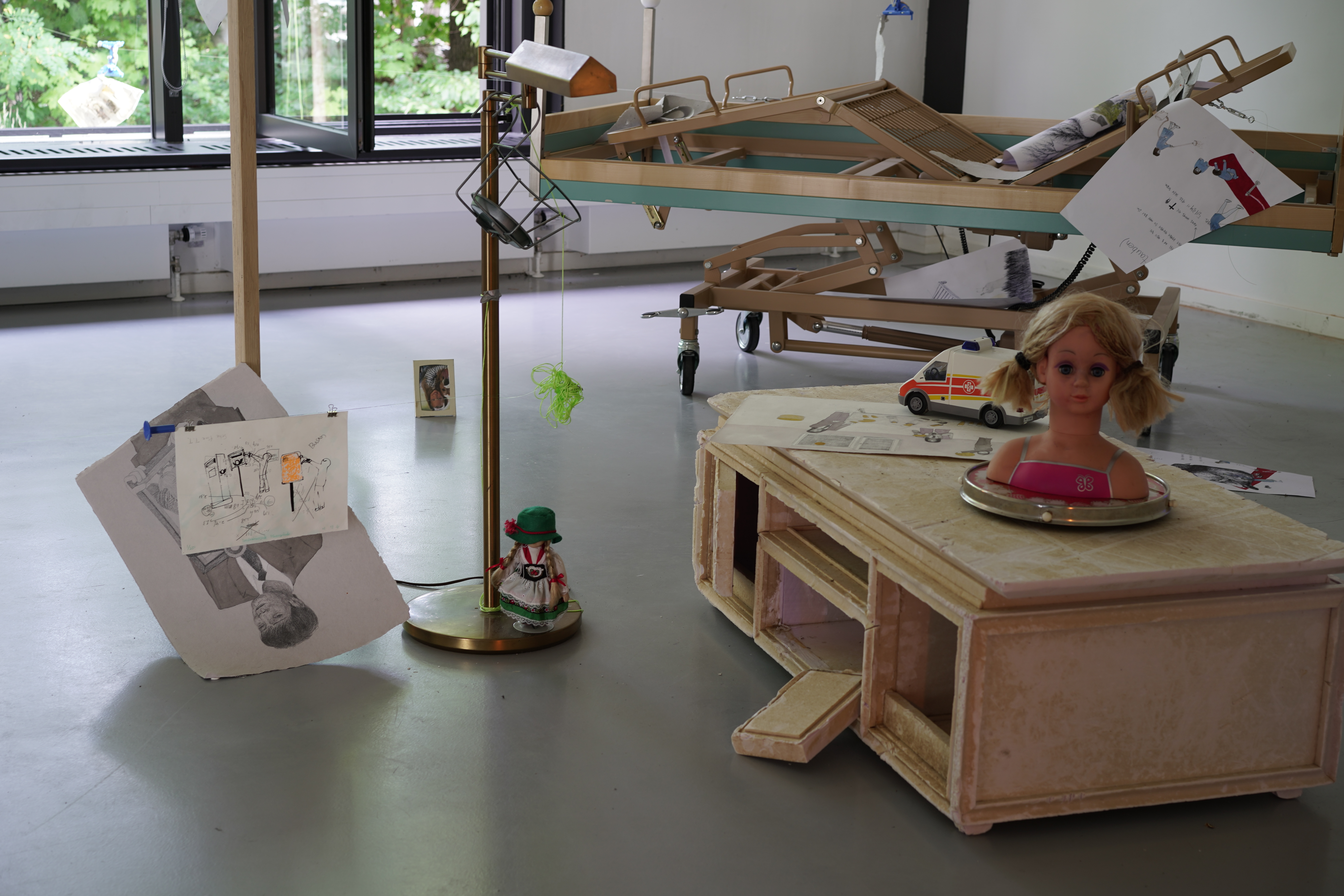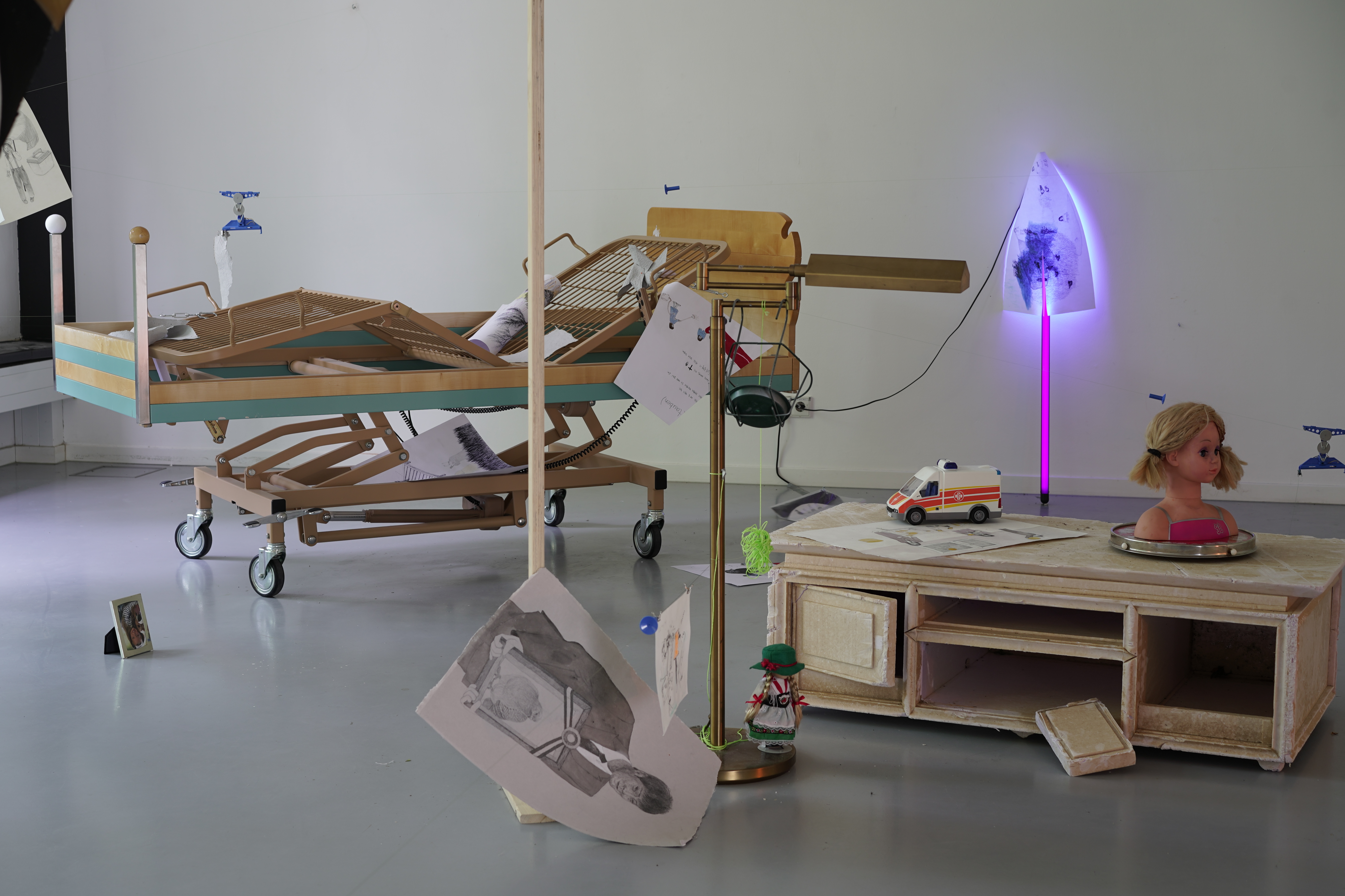 Material : Alte Zeichnunugen, Spielzeug Seilbahn, viele gebrauchte Sachen, Wasser Pump, UV-Lampe,Kronleuchter, Krankenbett, Kinderspielzeug