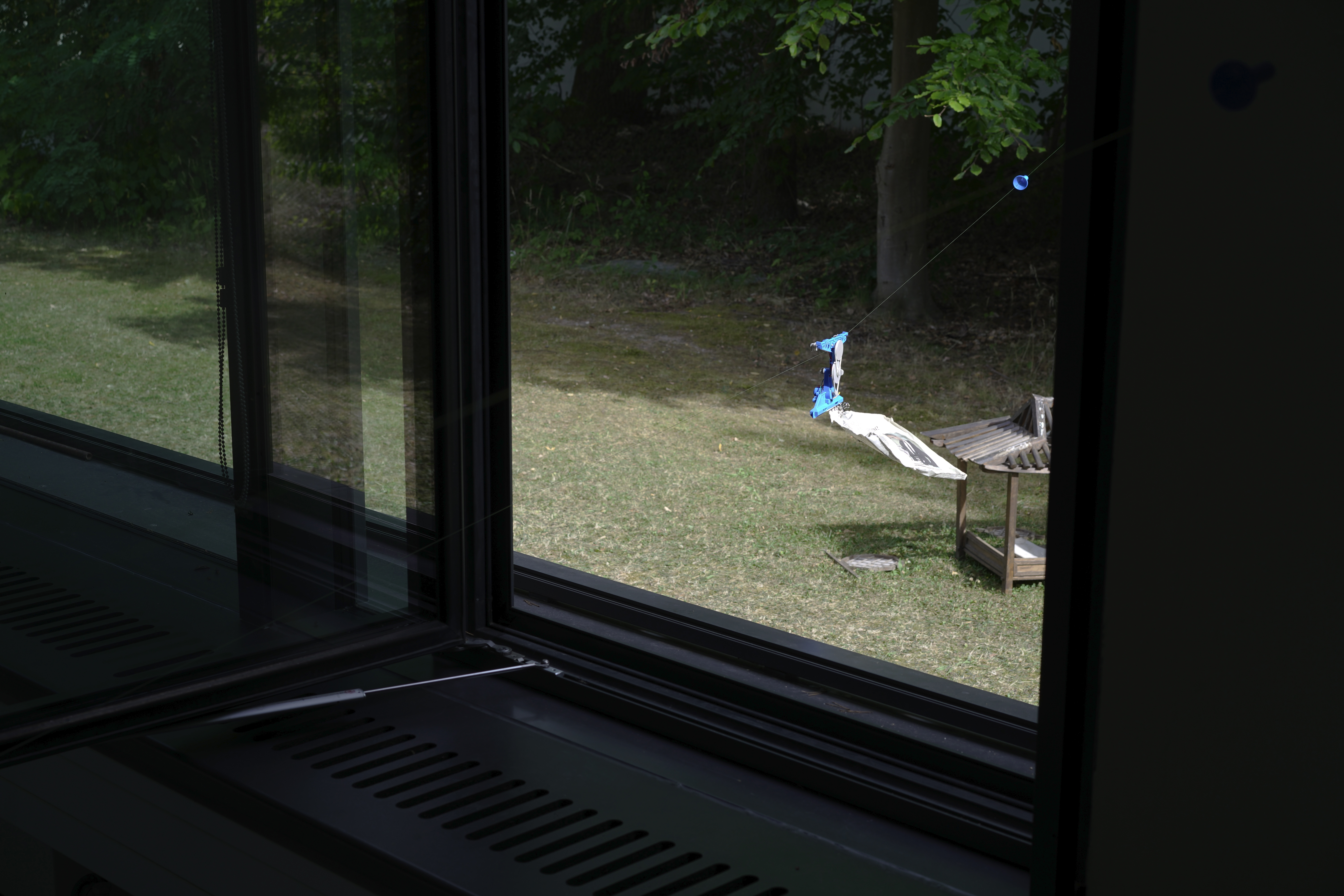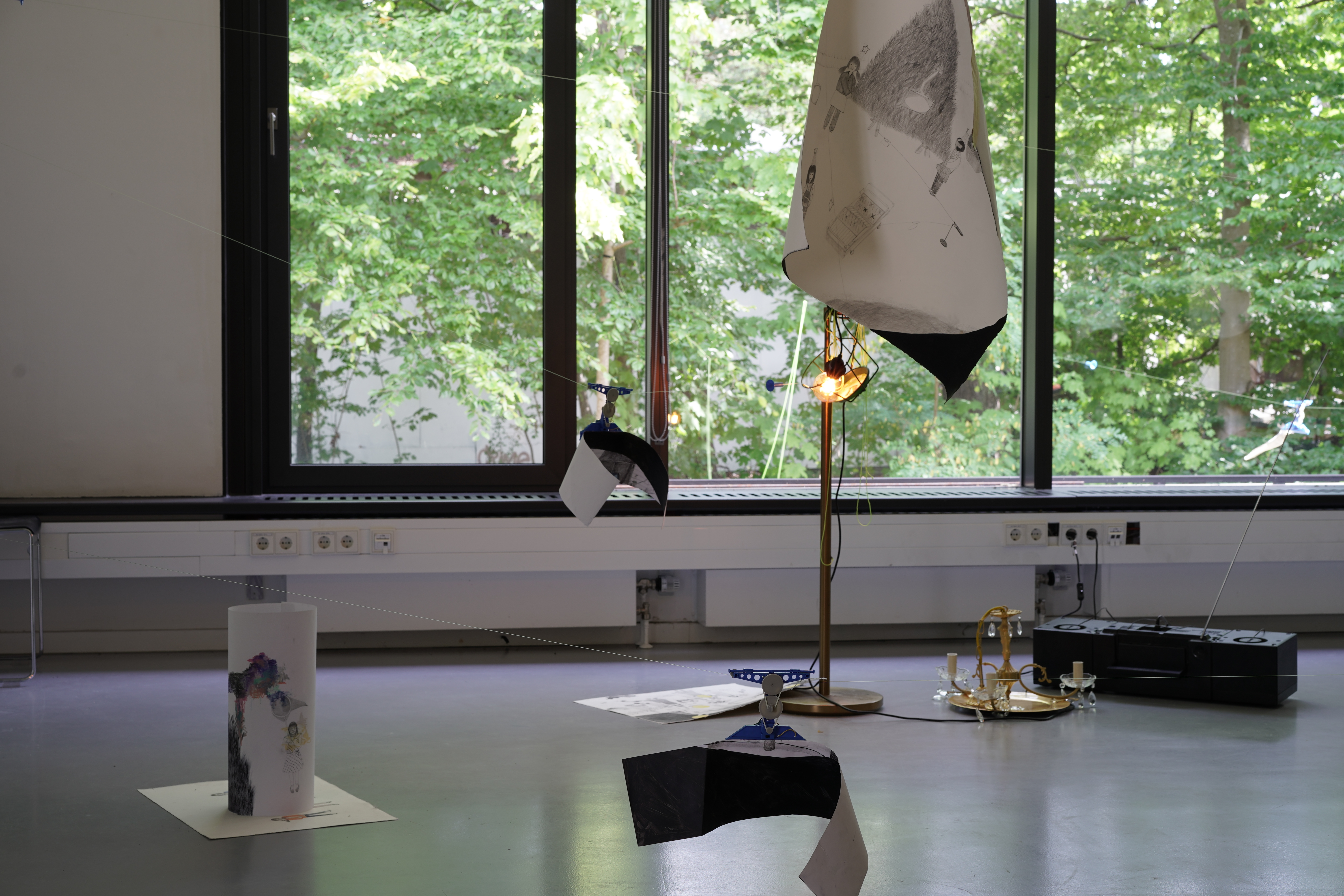 Die Arbeit erzählt die Geschichte einer Papierzeichnung, die noch nie ausgestellt wurde. Eine Spielzeugseilbahn hilft den Papierbildern zu reisen.